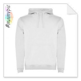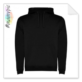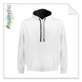 Mikina s kapucí a klokaní kapsou. Kapuce vyložená materiálem v kontrastní barvě. Šňůrky v kapuci v kontrastní barvě. Lemovka na průkrčníku a klokaní kapse. Lemování rukávů a spodní patent v žebrovaném úpletu 1x1.